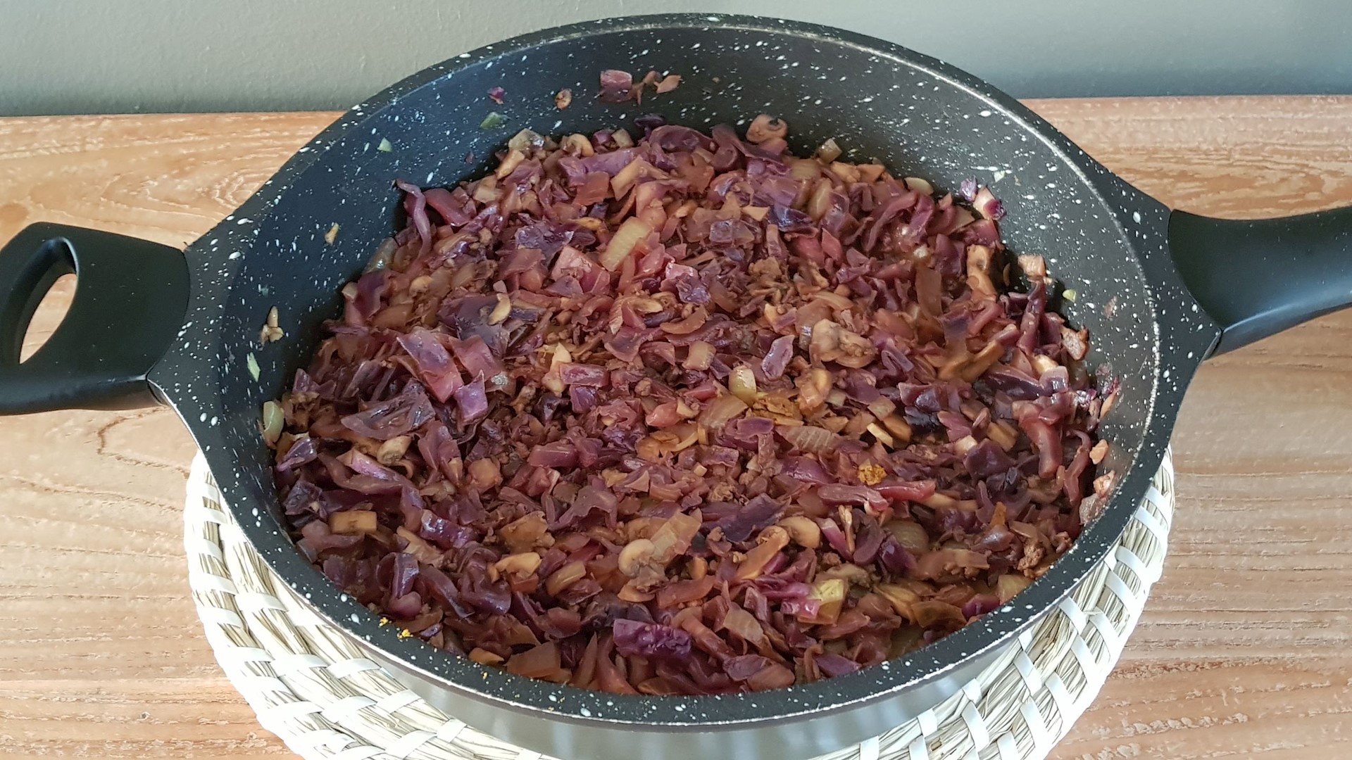 Voeg dan de rode kool toe, zet het vuur wat hoger en roerbak een paar minuten het hele spul.